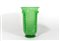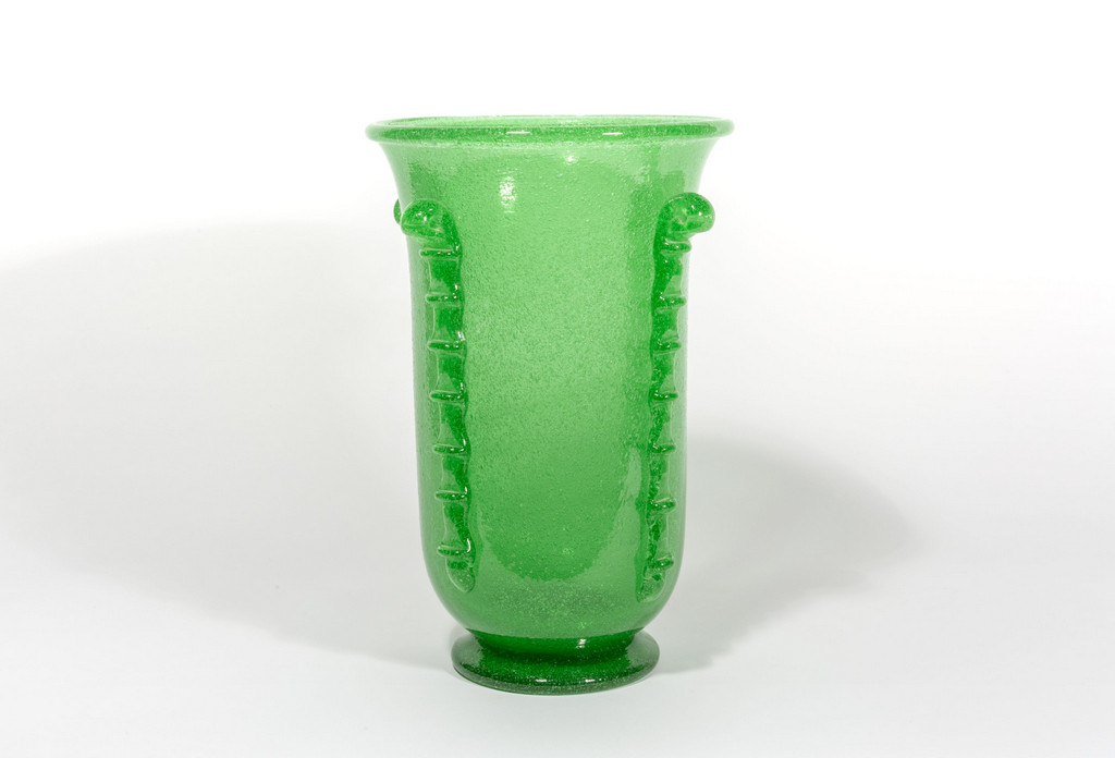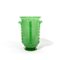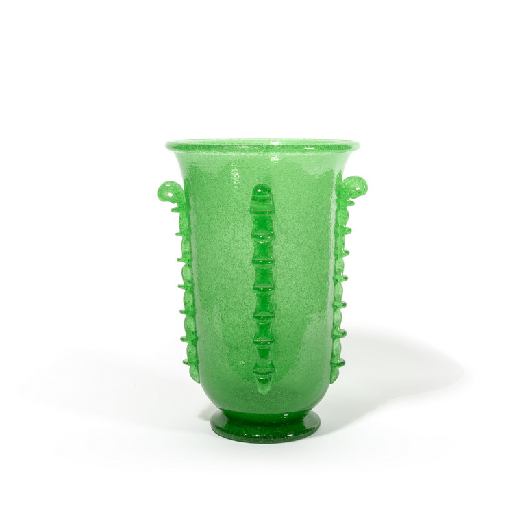 Un vaso in vetro verde a bollicine decorato a morise terminanti ad anello.
