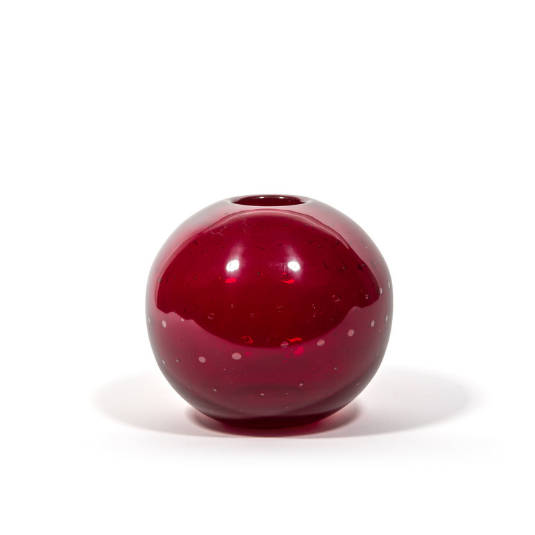 Un vaso a sfera in vetro trasparente rosso e bolle