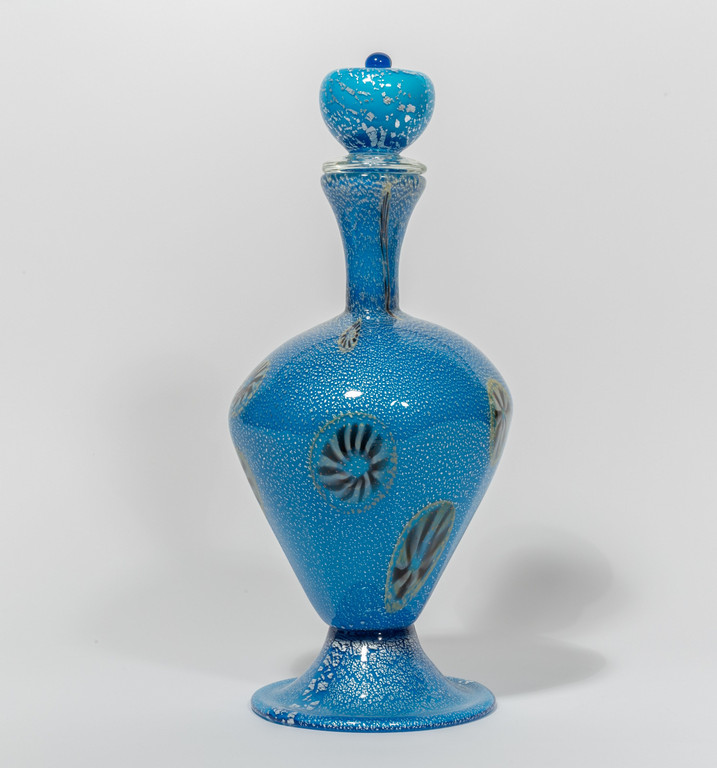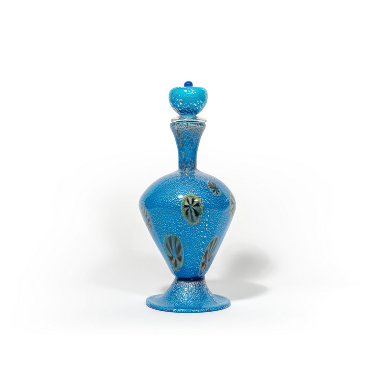 Una bottiglia incamiciata azzurra con decoro di murrine stellate