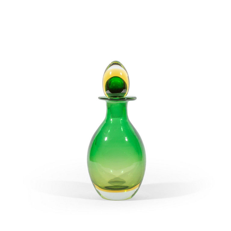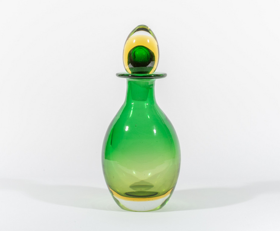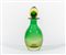 Una bottiglia in vetro sommerso verde e ambra.