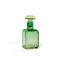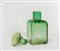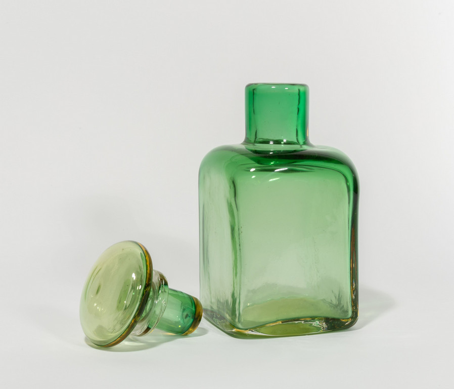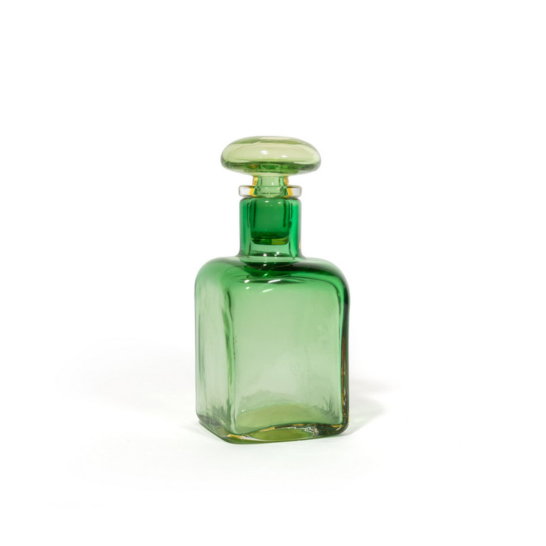 Una bottiglia a sezione quadrata in vetro trasparente verde.