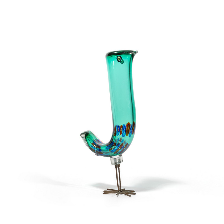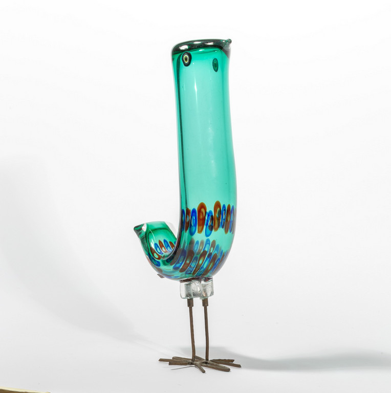 Una figura di uccellino in vetro soffiato verde con
