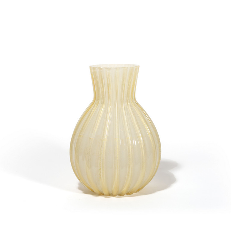 Un vaso costolato a sezione schiacciata in vetro