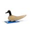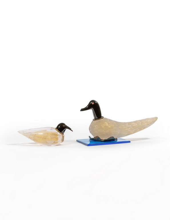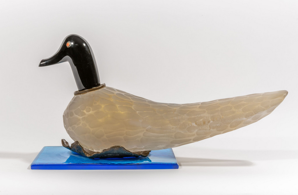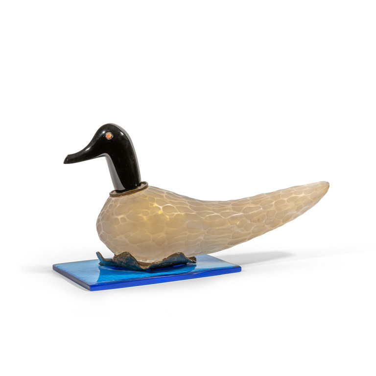 Una figura di anatra con corpo in cristallo molato e foglia oro testa nera e base in acquamarina e bronzo (probabile prototipo).