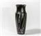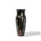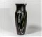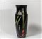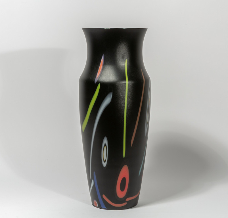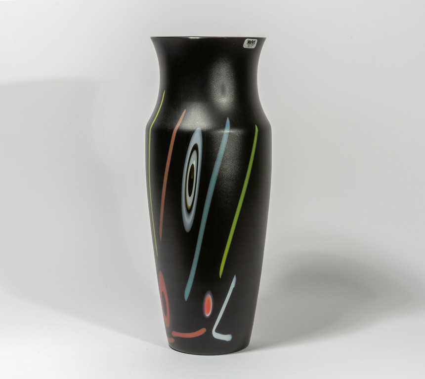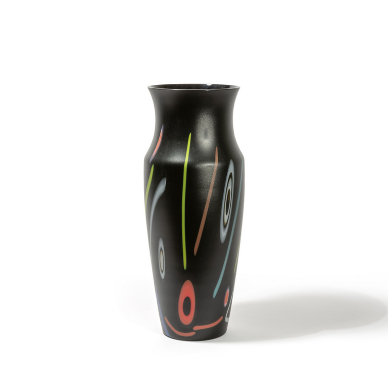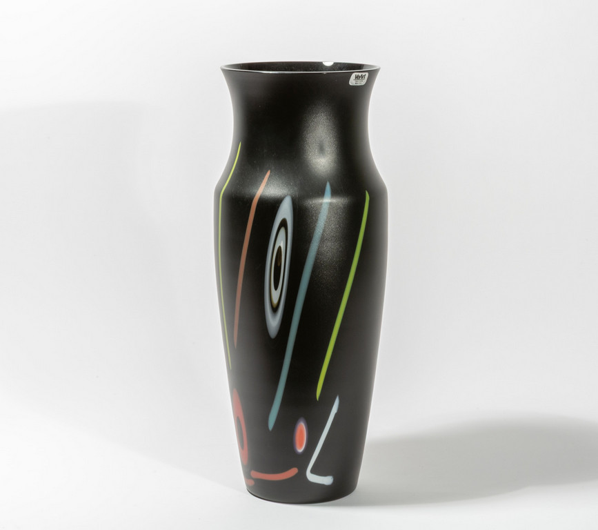 Un vaso in vetro nero satinato con decoro di murrine e canne colorate sparse.