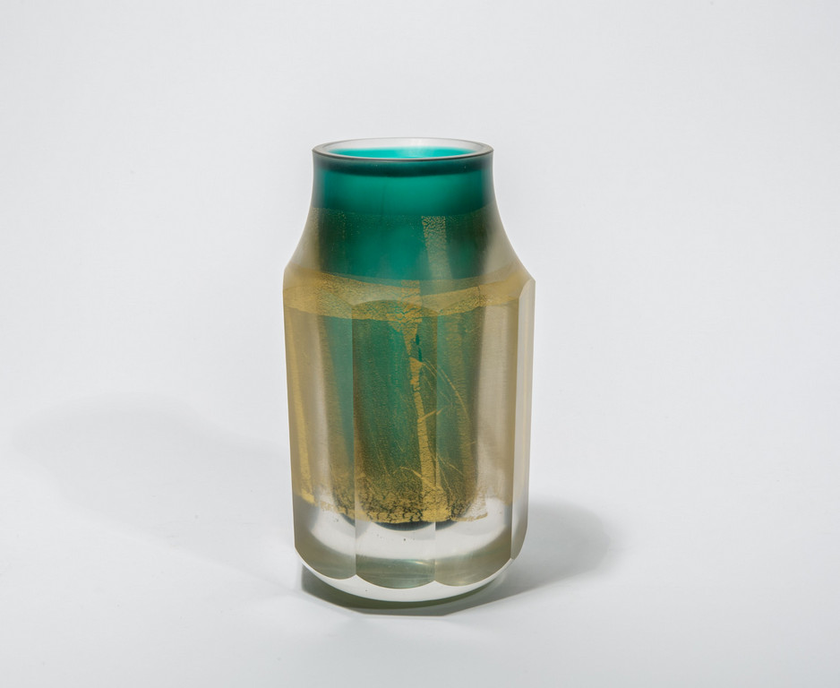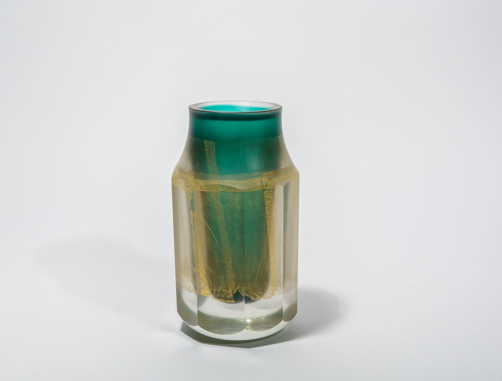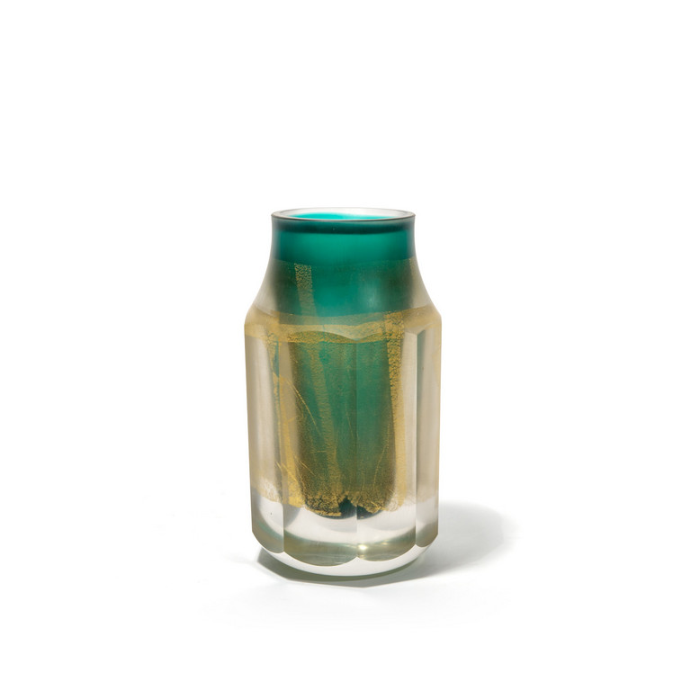 Vaso della serie 'i molati' in pesante vetro sommerso verde e foglia oro.