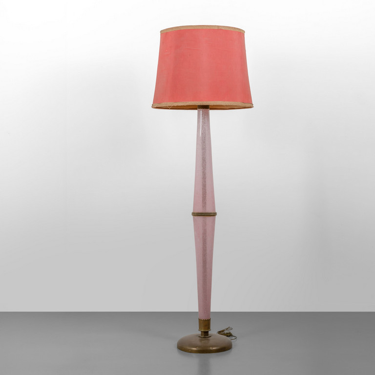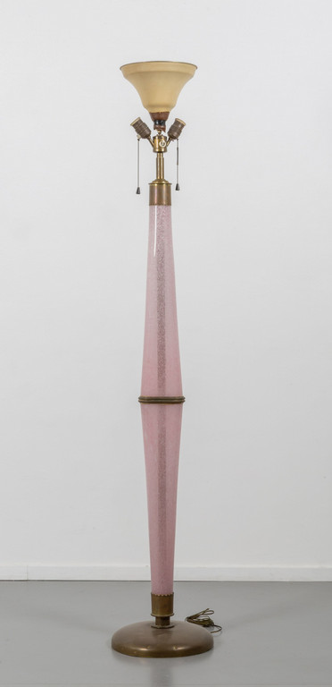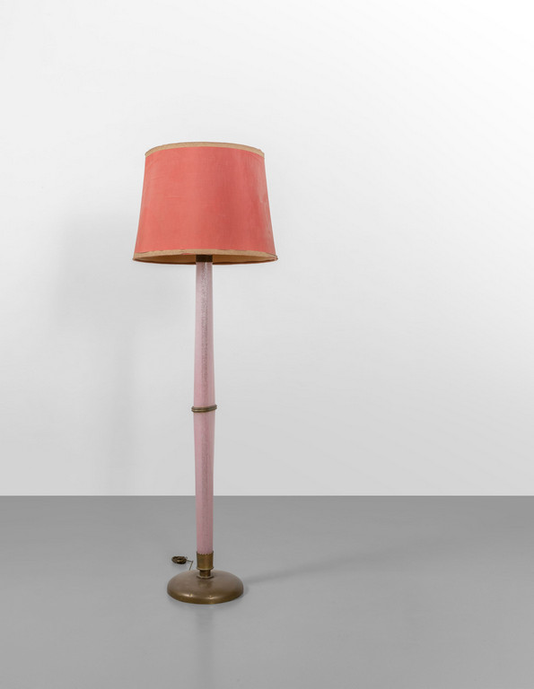 Pink pulegoso glass with an oval section fabric shade brass.
