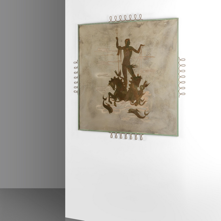 raffigurante Nettuno con nuvole e onde realizzate con dettagli in fili sottilissimi di bronzo e polveri d'orate