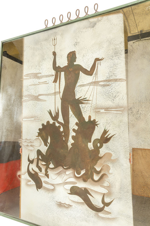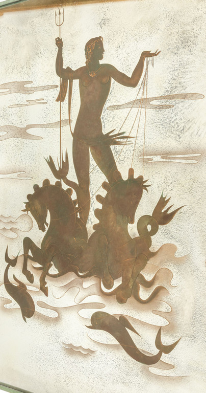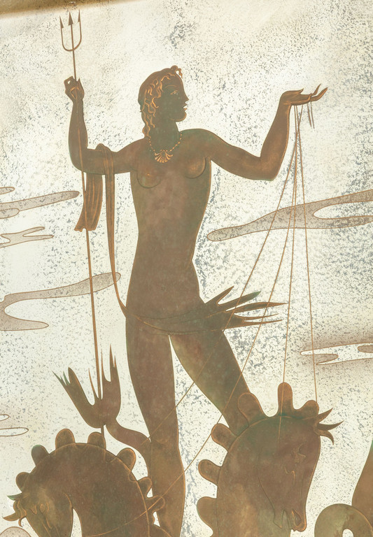 depicting Neptune with clouds and waves detailed with very thin bronze threads and gold dust