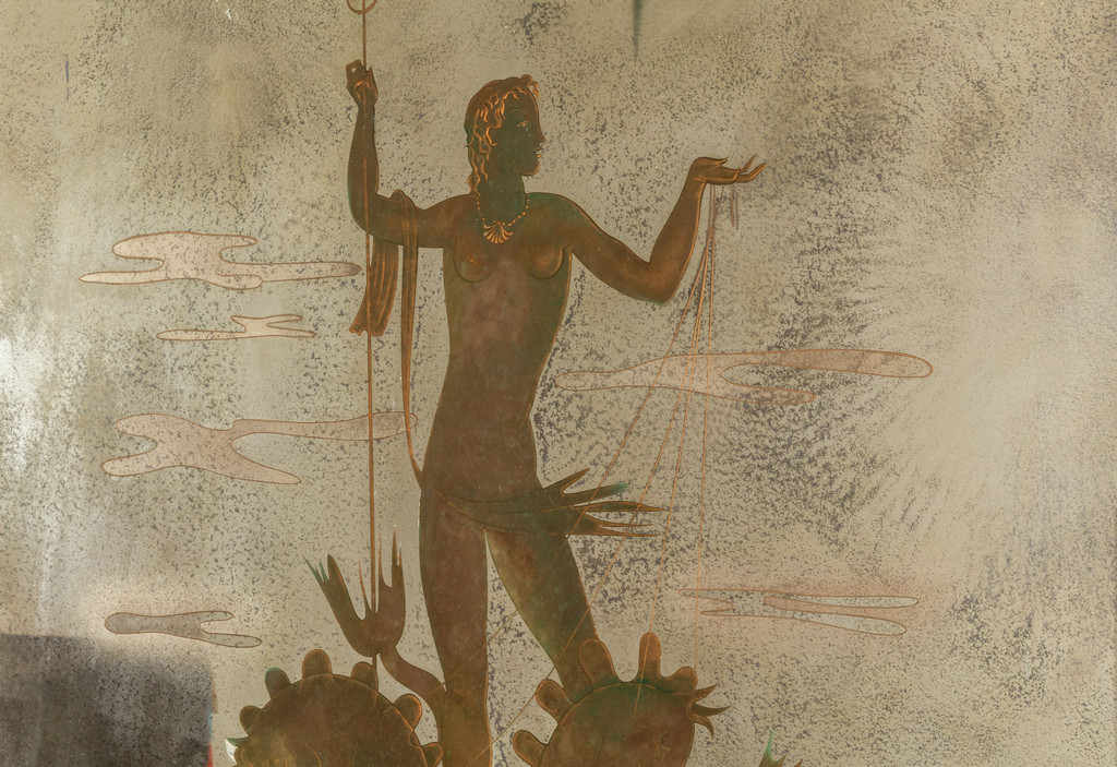 Doppio vetro quello interno in cristallo argentato con figure incise a getto di sabbia