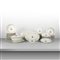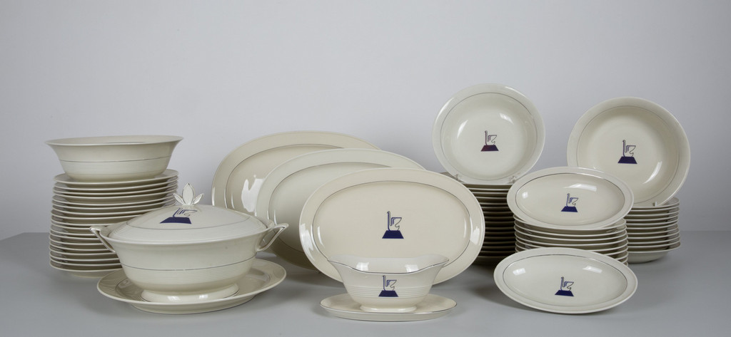 34 piatti piani 11 piatti fondi 11 piatti da frutta 6 piatti da portata (3 ovali e 3 ciotole) 1 salsiera 2 antipastiere e 1 zuppiera con piatto.