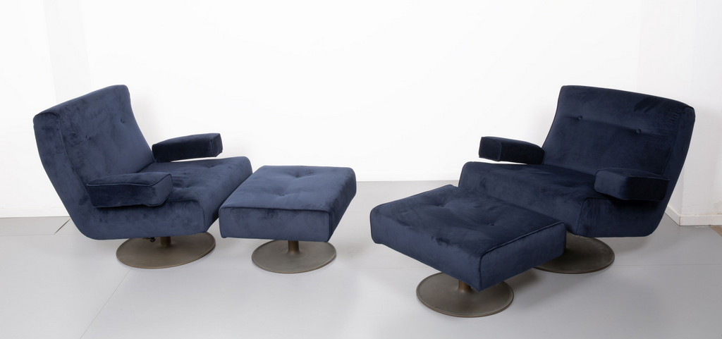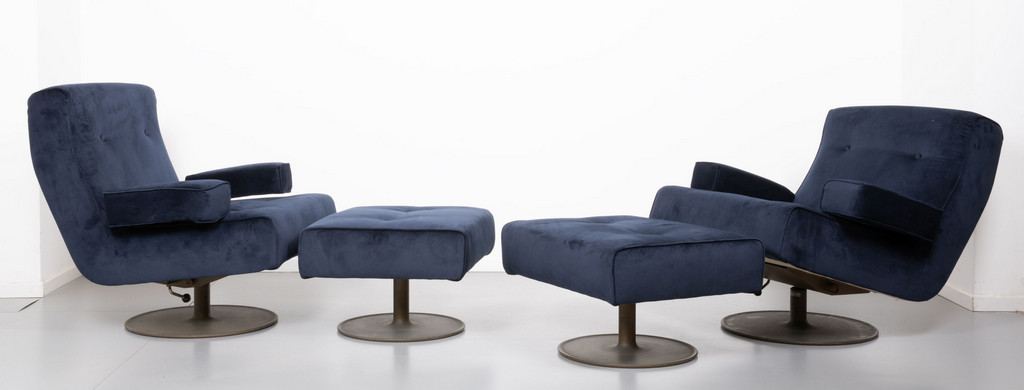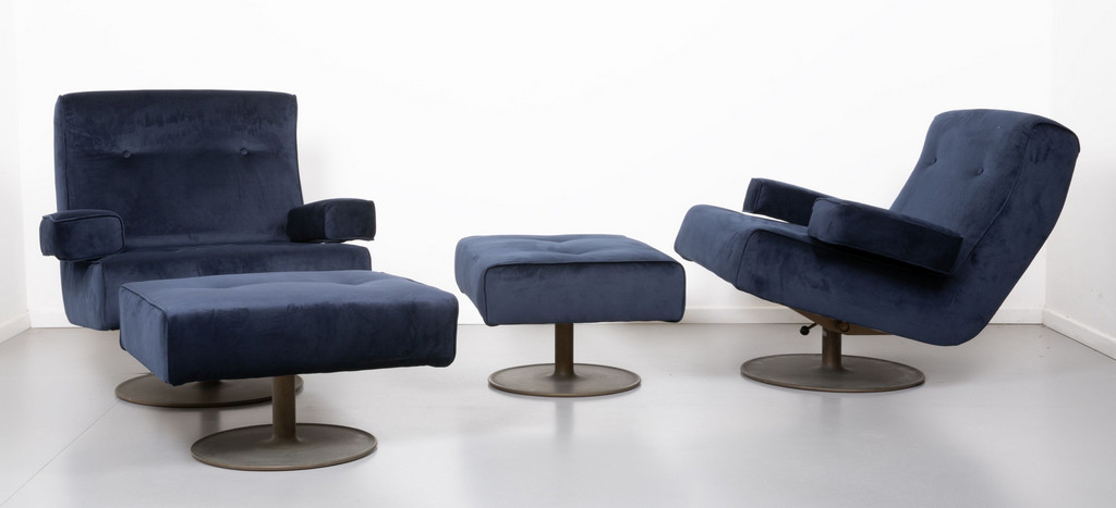 Due poltrone girevoli e oscillanti con poggiapiedi modello 'P103'.