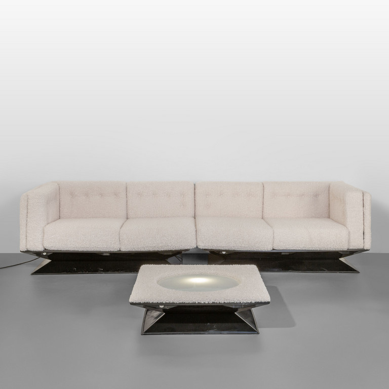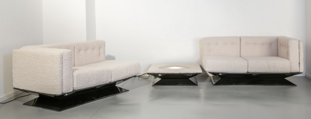 Due divani e un tavolino luminoso componibili della serie 'Vignola'.