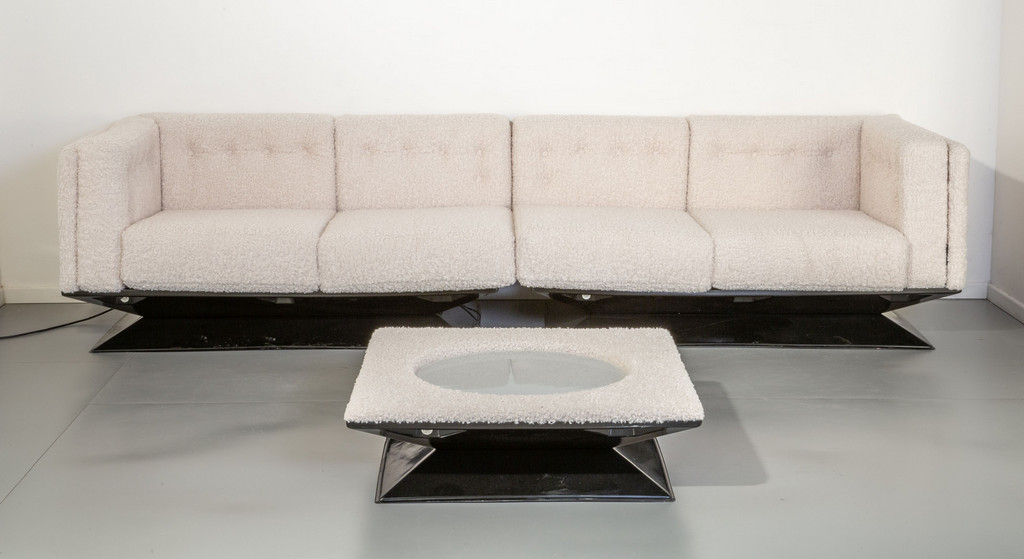 Strutture in legno basi in vetroresina verniciata rivestimenti in tessuto bouclé vetro opalino.