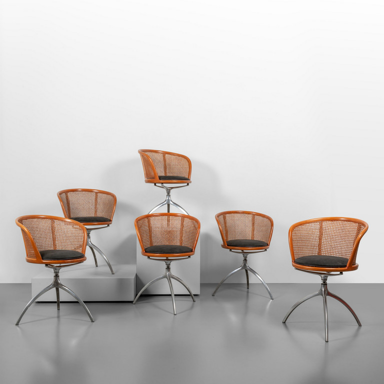 Die-cast aluminum structures beech and rattan seats cushions covered in Alcantara.