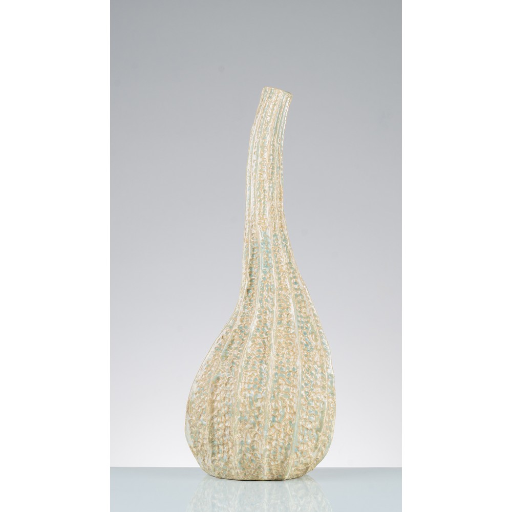 Vaso con corpo di zucca in ceramica smaltata gialla e verde, superficie decorata con rigature verticali e piccoli alveoli, collo sagomato con bocca circolare.