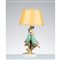 Lampada da tavolo ad una luce, in ceramica smaltata ed invetriata decorata in policromia, corpo con due pappagalli su tralcio. Diffusore in tessuto avorio. Marchio di produzione e numerazione A919.