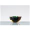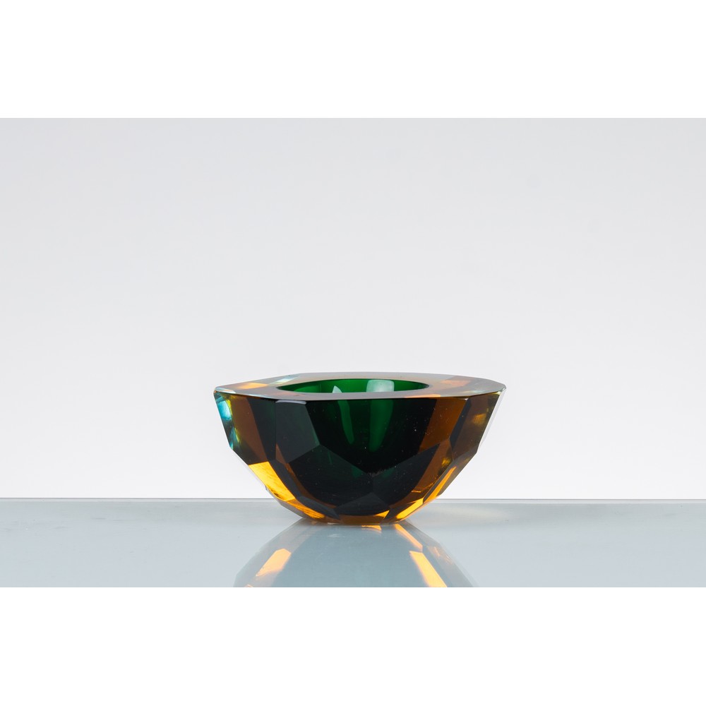 Posacenere in vetro sommerso incolore, giallo e verde, corpo semisferico con sfaccettature, cavità circolare.