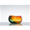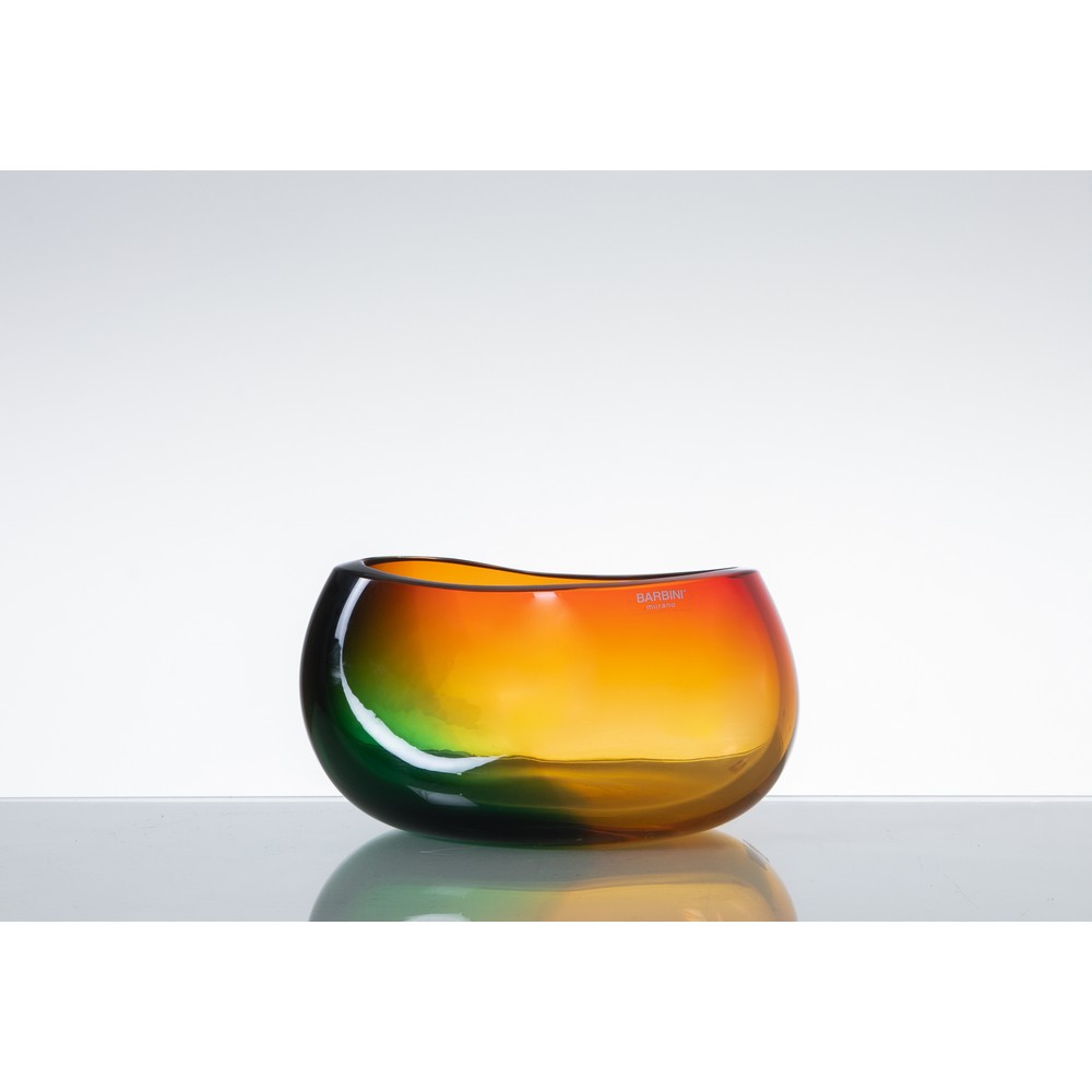Coppa in vetro a sfumare rosso, giallo e verde, corpo sferico con bocca piana ondulata. Etichetta e firma a graffio.