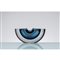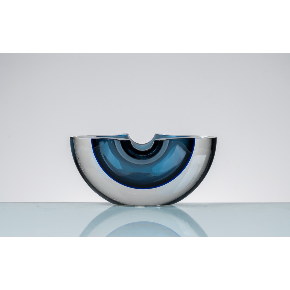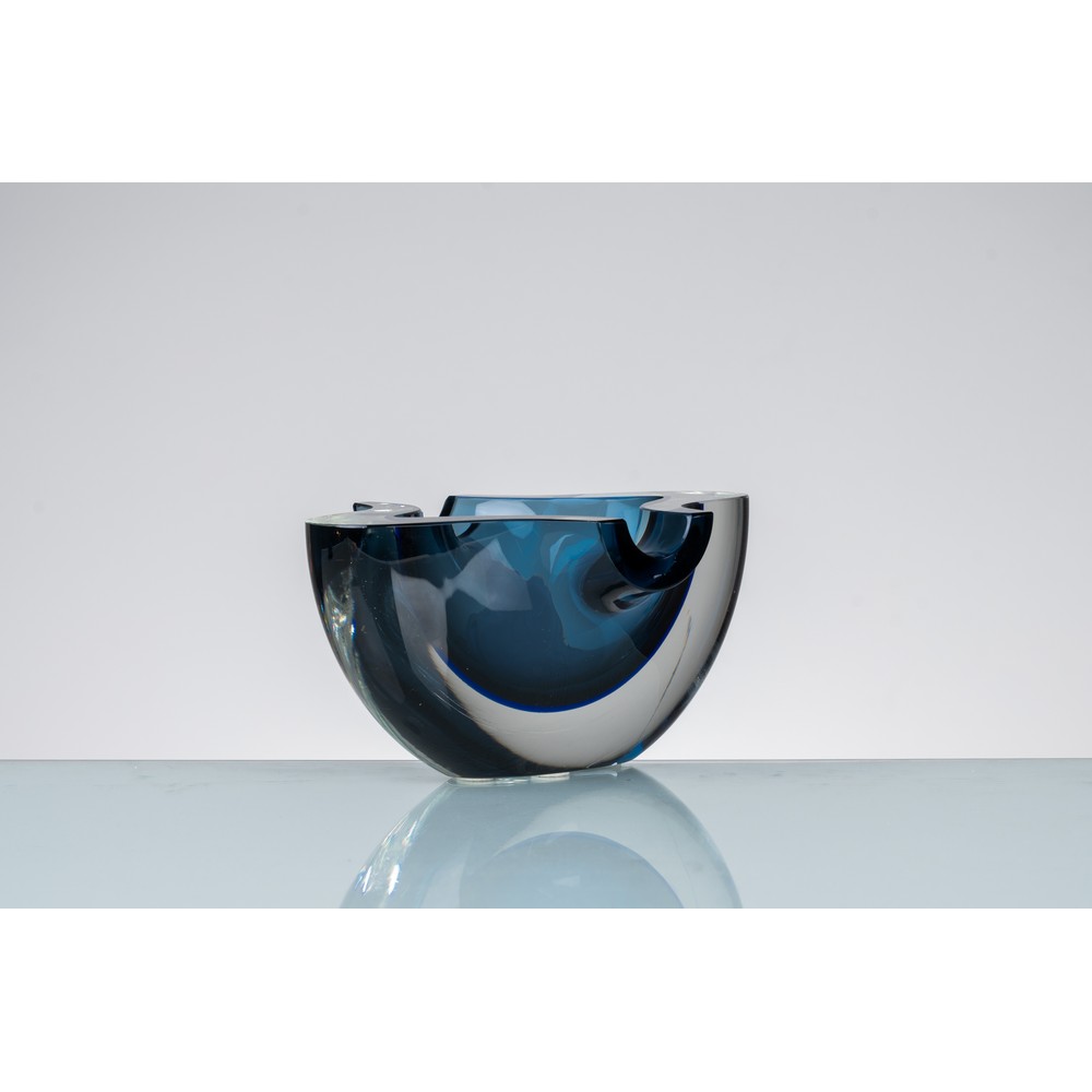 Posacenere in vetro sommerso incolore, grigio e blu, corpo a coppa ovalizzata con sostegni per sigarette sagomati.
