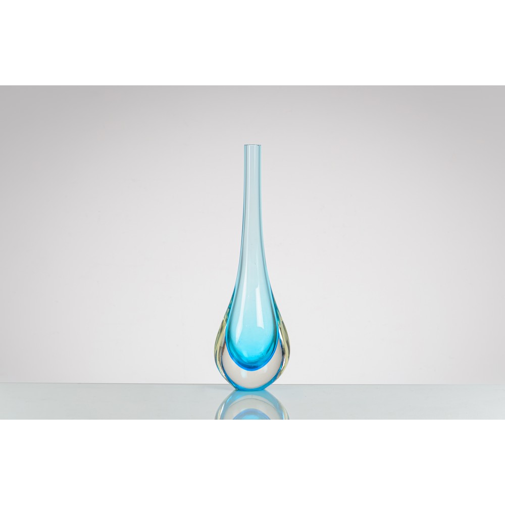 Vaso in vetro sommerso, blu, turchese e incolore, corpo a goccia, collo alto e stretto, bocca circolare piana. Firma a graffio.