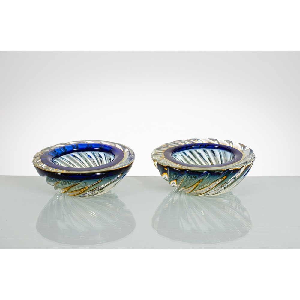 Coppia di ciotole in vetro sommerso incolore, paglierino e blu, corpo semisferico a costole diagonali, bocca circolare.