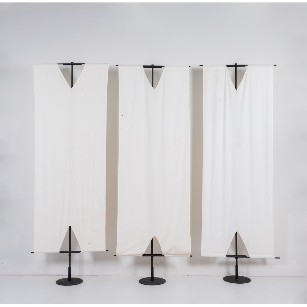 Tre moduli paravento con struttura in metallo verniciato nero, telo in tessuto bianco. Segni di uso e macchie.