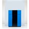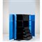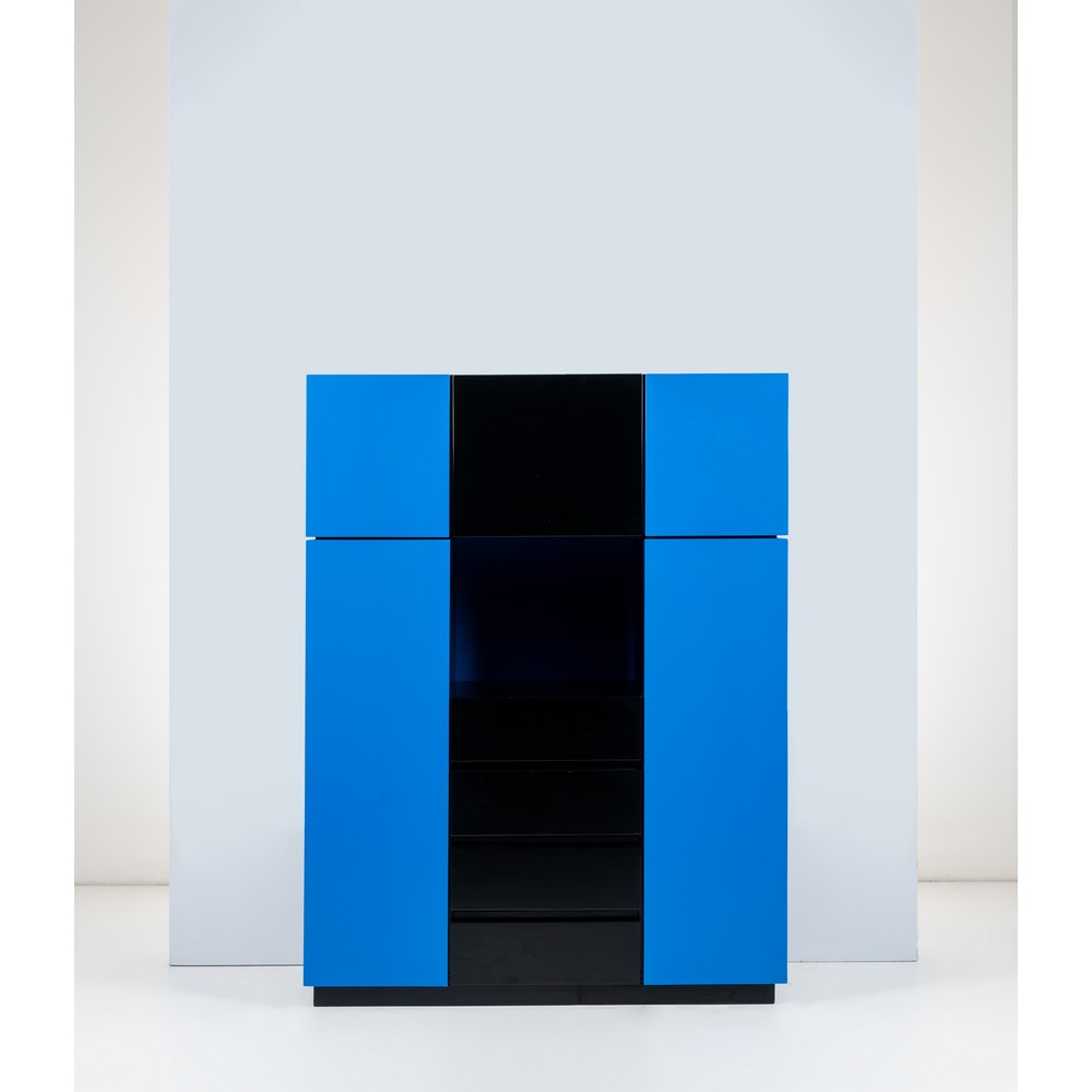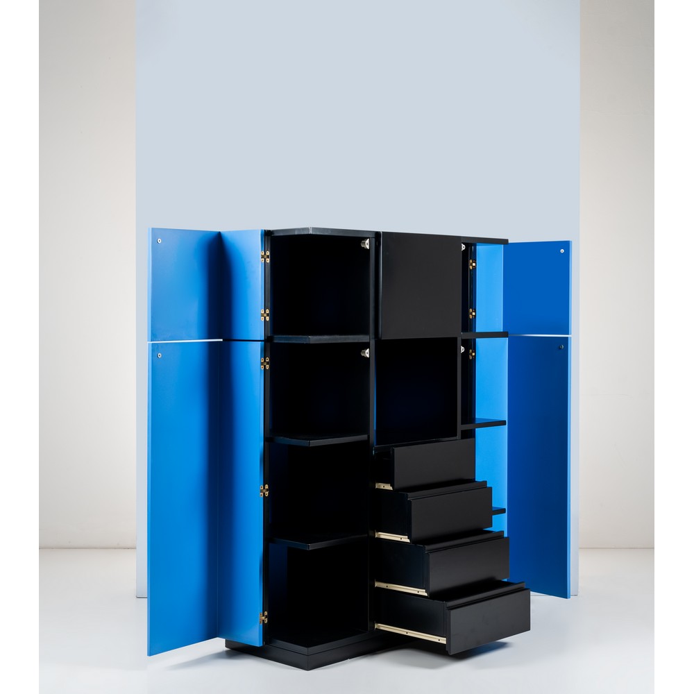 Credenza in legno laccato nero e blu azzurro, vani contenitori di diversa dimensione chiusi con ante battenti, quattro cassetti.