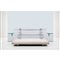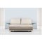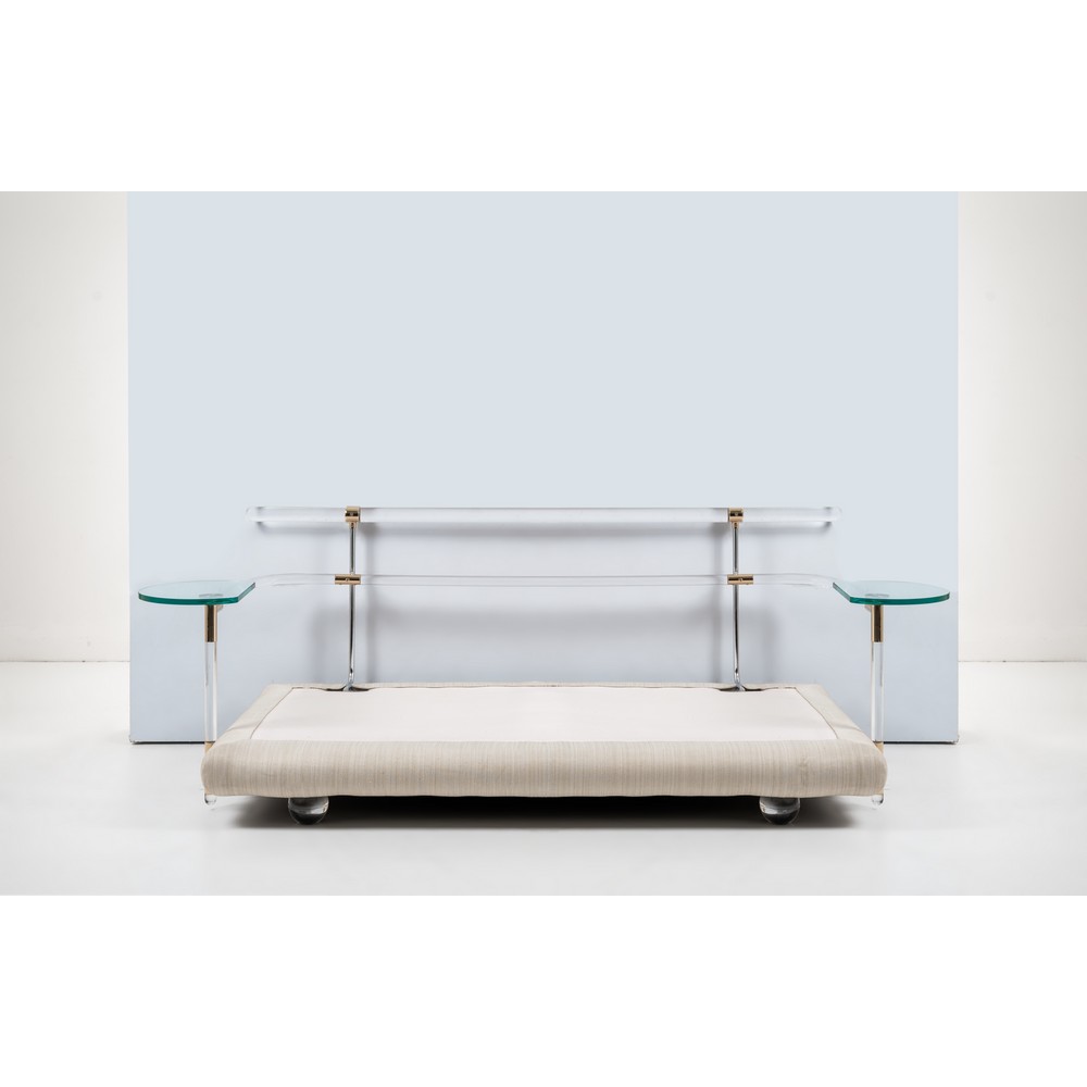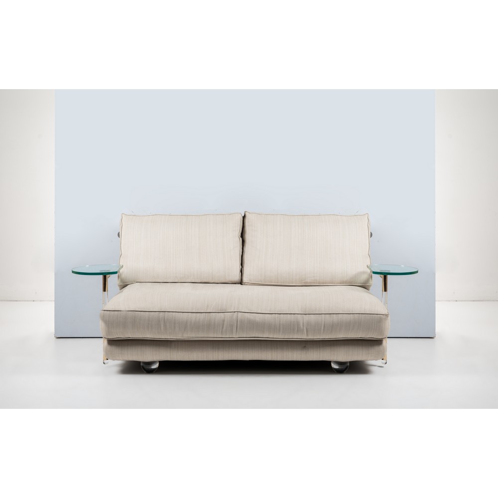 Divano a due posti con struttura mista in metallo, legno e plexiglass incolore, imbottitura con rivestimento in tessuto avorio, due piccoli piani rotanti sagomati in cristallo incolore di grosso spessore, ottone. Piedi sferici in plexiglass. Segni di uso.