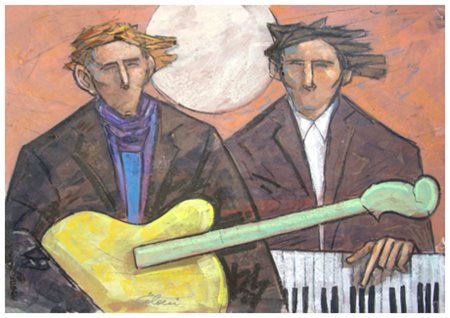 GIAMPAOLO TALANI San Vincenzo 1955 Musicisti blues 2015 T.m. su cartone 35 x 50. in b. al c.; sul verso num. archivio, firme, titolo e data + timbro “Oltremare Arte” Castiglioncello. Autentica dell’autore su foto.