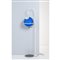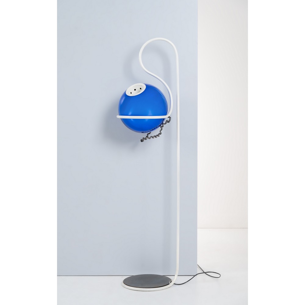 Lampada da terra ad una luce, struttura in metallo verniciato bianco, diffusore sferico globulare in cristallo specchiato blu.