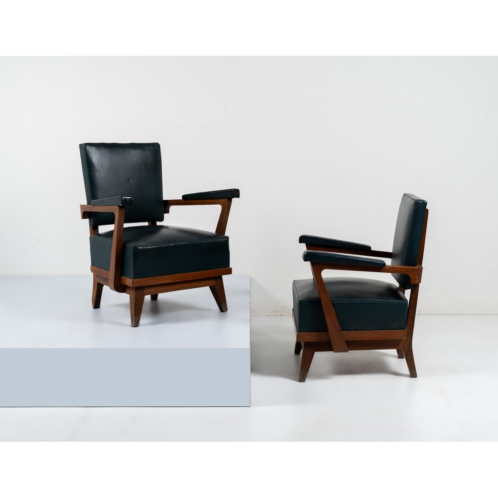 Coppia di poltrone con struttura in legno, seduta e spalliera con imbottitura e rivestimento in skai verde. Segni di uso e tracce di tarlo morto.
