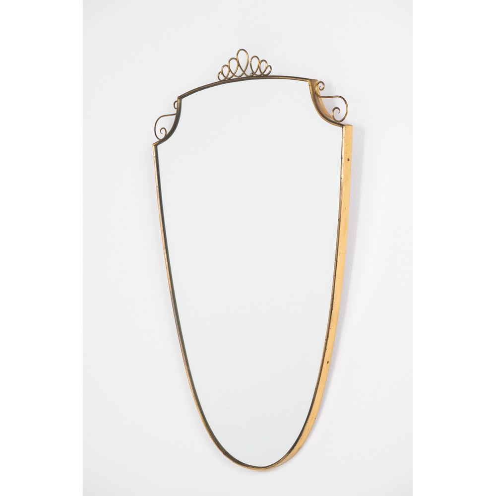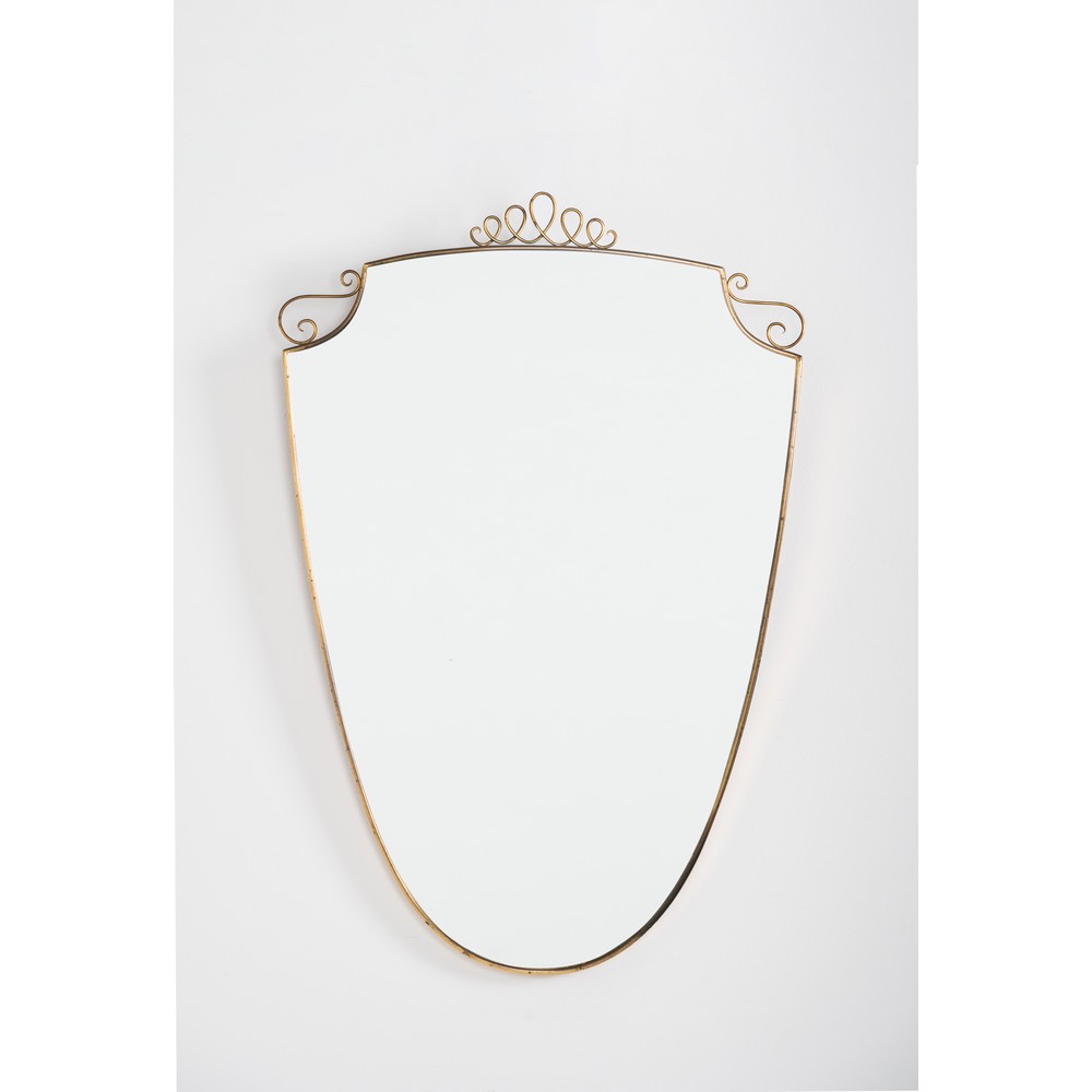 Specchio da parete con cornice sagomata in ottone, cristallo specchiato, decori superiori in tondino di ottone.