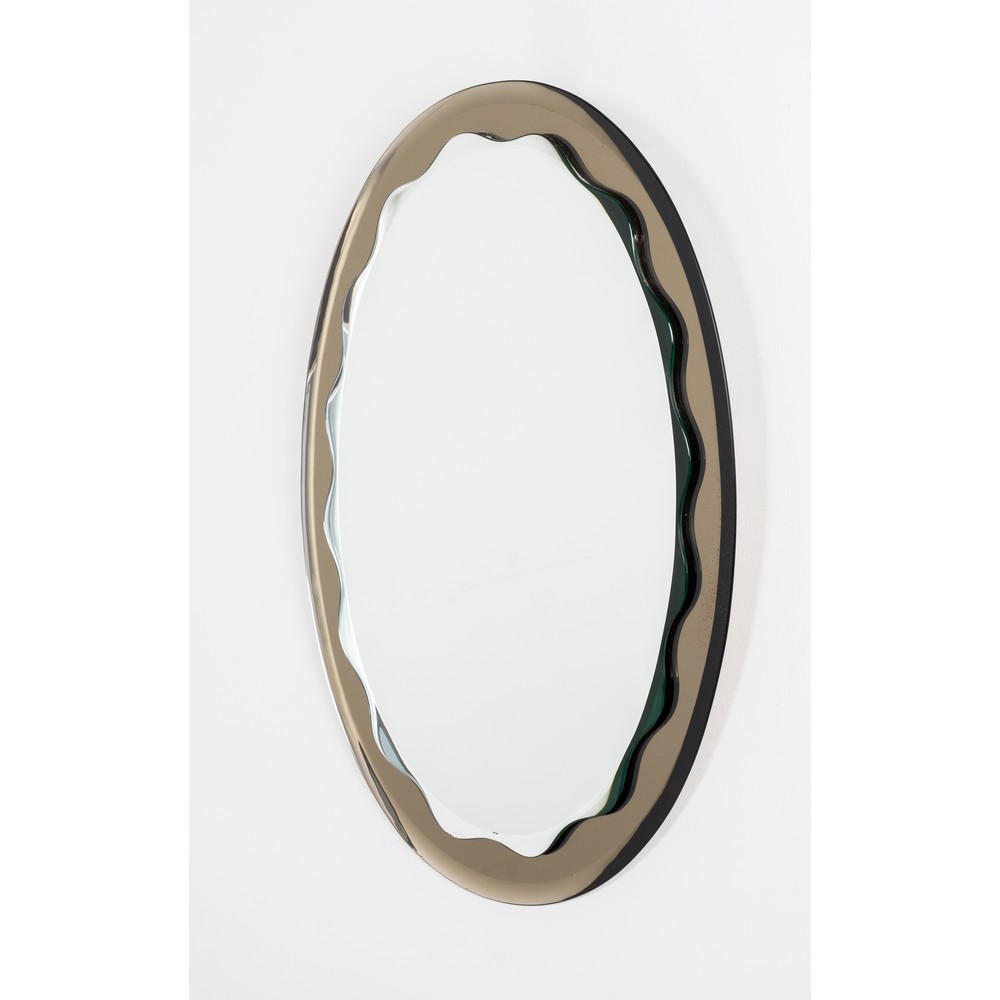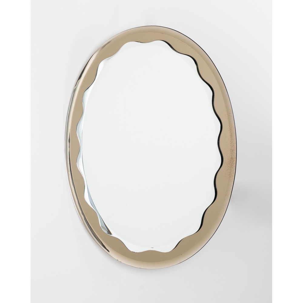 Specchio da parete di forma ovale con cornice in cristallo fumè, cristallo specchiato e ondulato lungo i bordi.