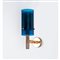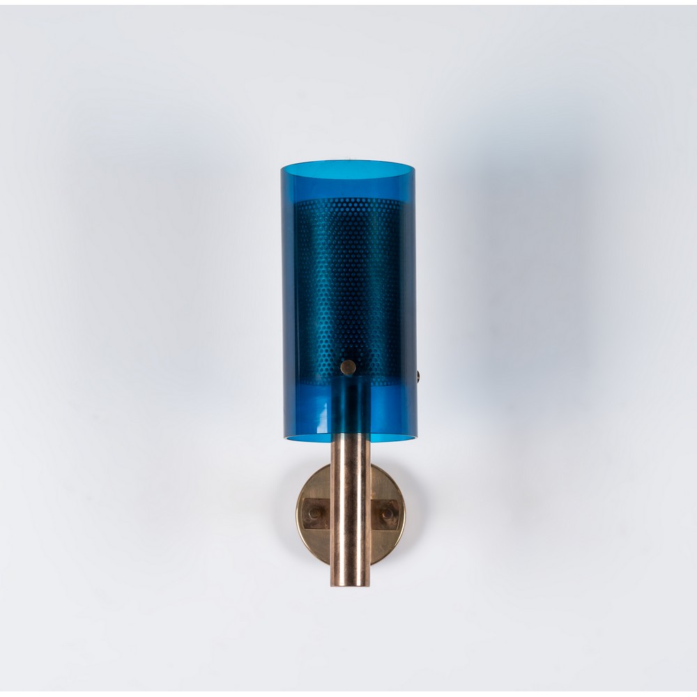 Lampada da parete ad una luce, struttura in ottone con diffusore cilindrico in vetro blu e metallo microforato.