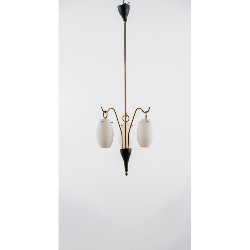 Lampada a sospensione a tre luci, struttura in ottone e metallo verniciato nero, diffusori ovalizzati in vetro opalino lattimo.