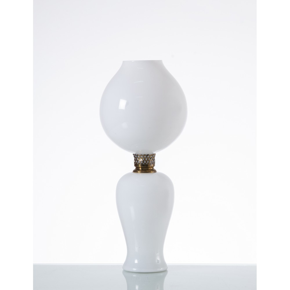 Lampada da tavolo ad una luce modello “850.2” del catalogo verde, base e diffusore in vetro incamiciato lattimo. Minuterie in ottone. Etichetta originale e firma all’acido Venini Italia.