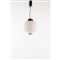 Lampada a sospensione ad una luce, diffusore globulare in vetro opalino, raccordi in legno di teak e in ottone.