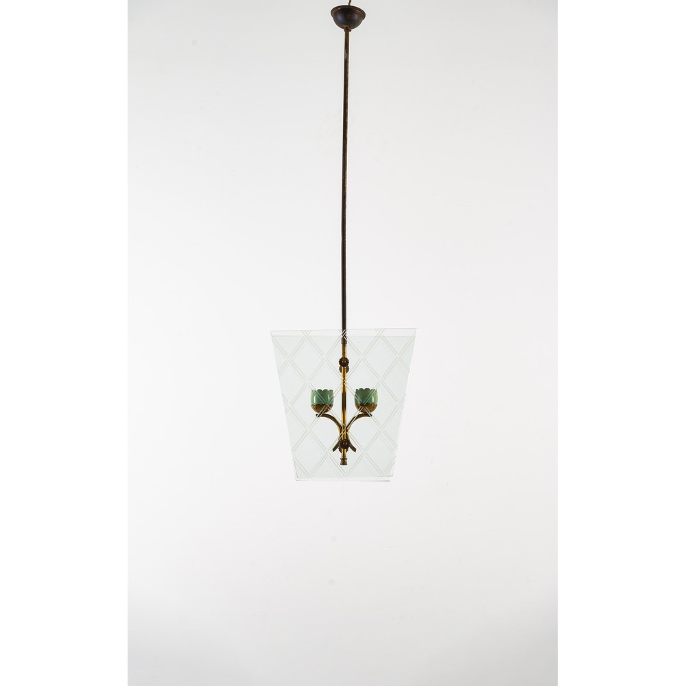 Lampada a sospensione a due luci, struttura in ottone con diffusore composto da due lastre di cristallo incise a rombi, portalampada a fiore in metallo verniciato verde.