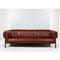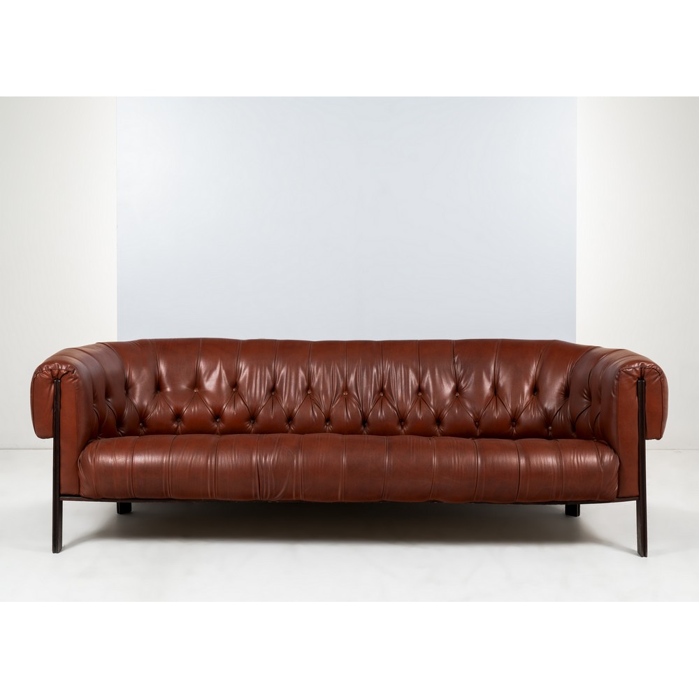 Divano tre posti con struttura in legno esotico, imbottitura e rivestimento in pelle marrone a lavorazione capitonnè.
