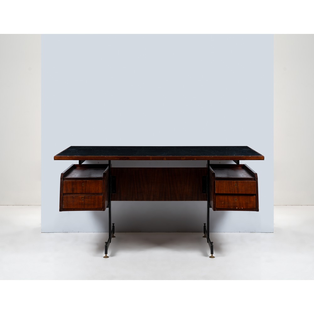 Scrivania con telaio in metallo laccato nero. Struttura in legno esotico con piano rettangolare, due cassettiere sotto piano con due cassetti. Segni di uso e piccoli difetti.