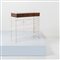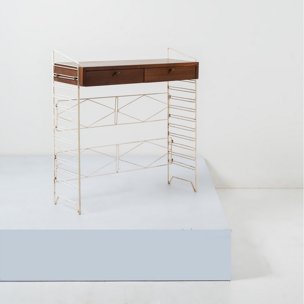 Scrittoio con struttura intelaiata di tondino metallico verniciato bianco, piano rettangolare in legno, sul fronte due cassetti con chiusura. Segni d’uso.