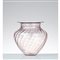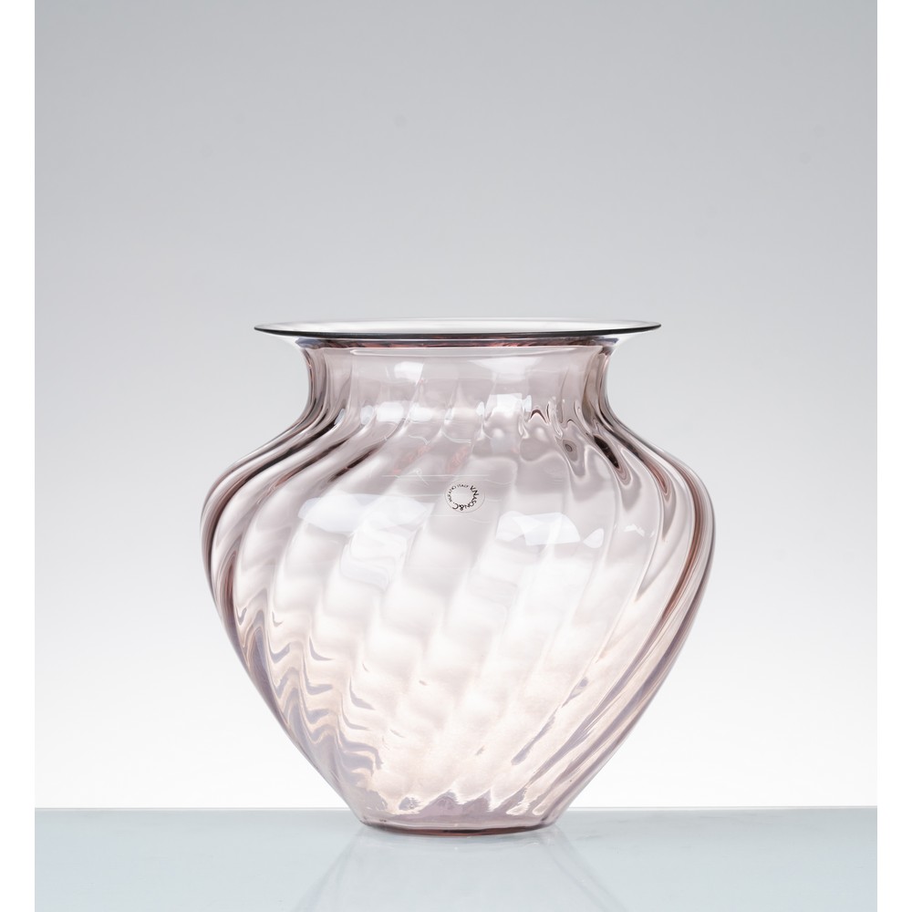 Vaso in vetro ametista, corpo sferico con decoro a fasce diagonali, largo collo, bocca circolare estroflessa. Etichetta di produzione.