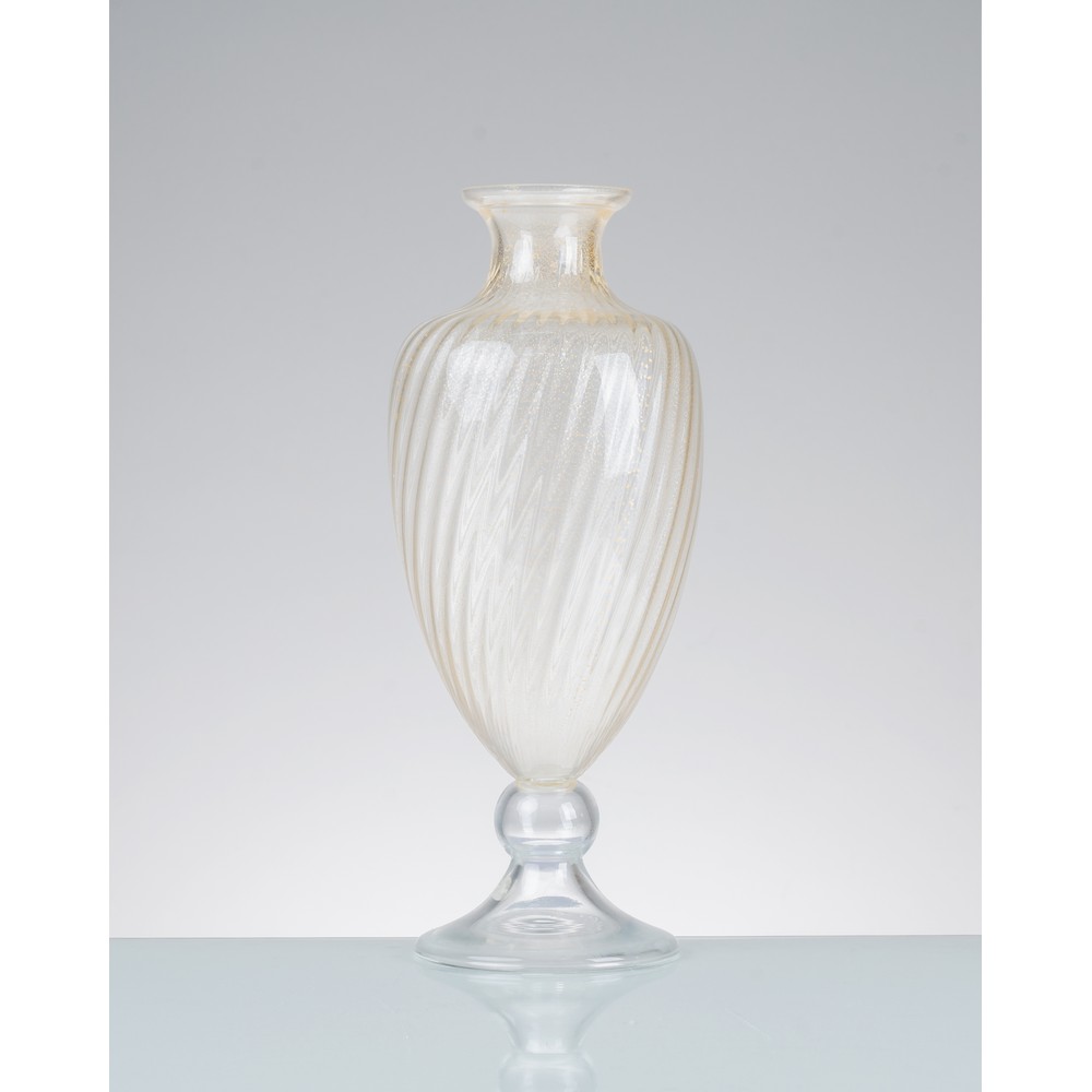 Vaso in vetro incolore con inclusioni oro, corpo ovalizzato decorato con costolature diagonali, collo a vaso, bocca circolare piana, base circolare. Tracci di vecchia etichetta.