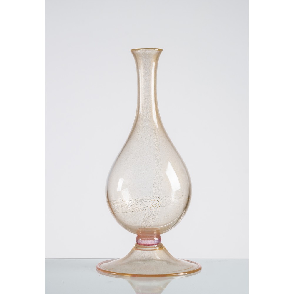 Vaso in vetro laguna rosa con inclusioni oro, corpo a goccia, lungo collo con bocca piana circolare, base circolare a campana.