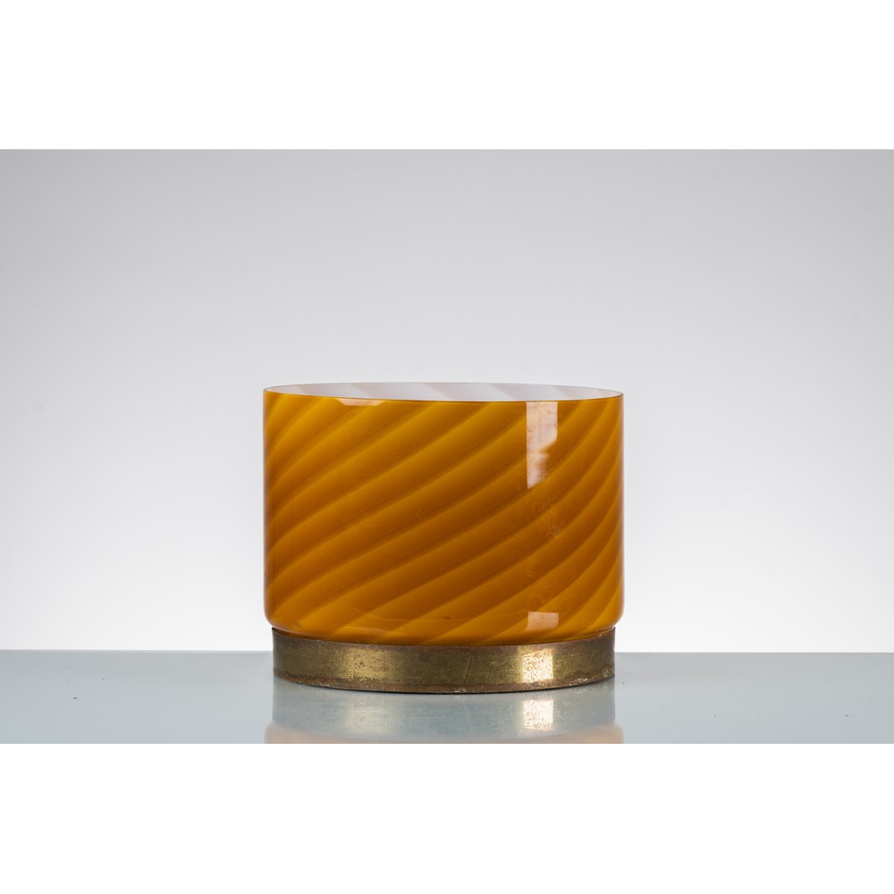 Cachepot modello “Sun” in vetro incamiciato a decoro spirale ambra e marrone, base in ottone. Marchio di produzione.