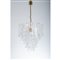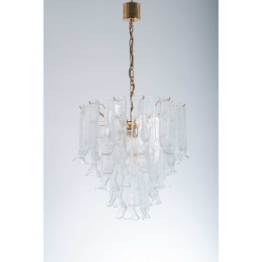 Lampada a sospensione a cinque luci, struttura in metallo dorato, diffusore composto da elementi in vetro a tegola in vetro corteccia incolore trasparente e lattimo.