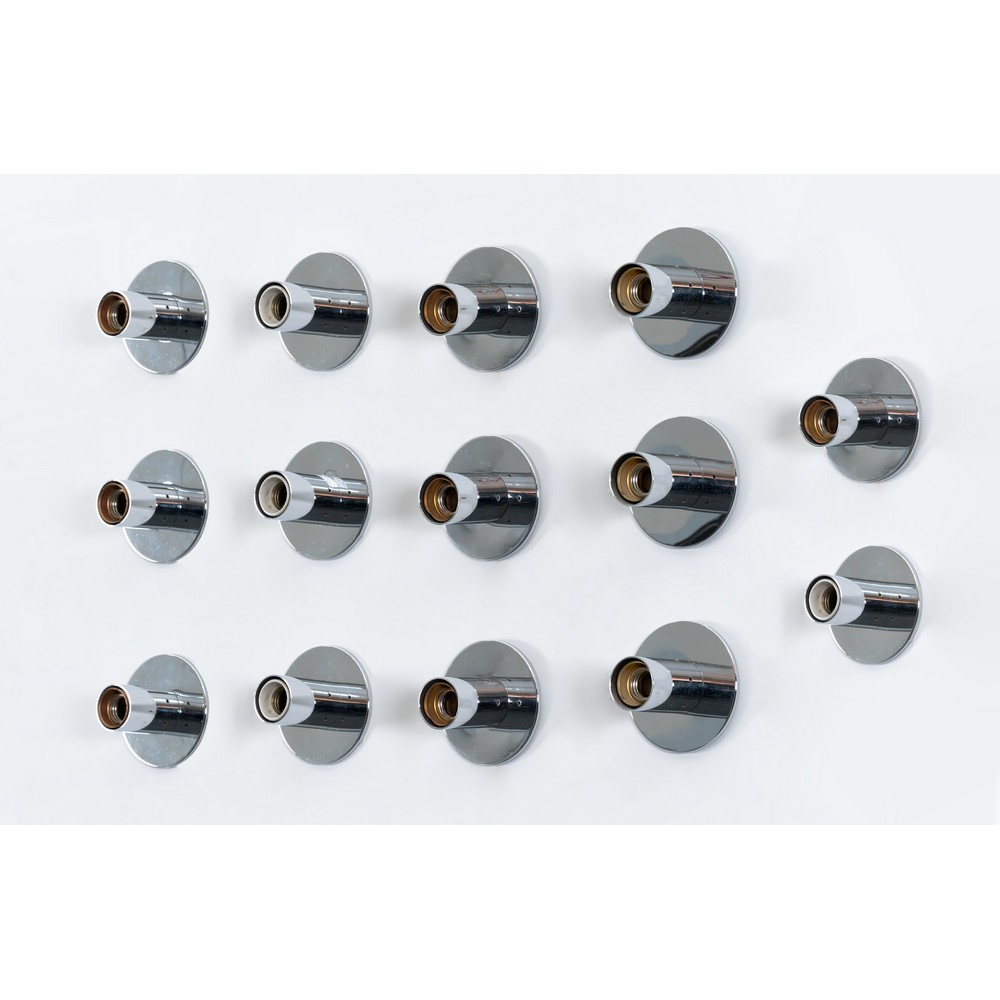 Quattordici lampade ad una luce da soffitto/parete modello “Goro” in ottone nichelato, diffusore cilindrico su base circolare.