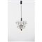 Lampada a sospensione a quattro luci, struttura in metallo cromato con diffusore composto da cristalli rettangolari sfaccettati, corpo circolare su due piani.