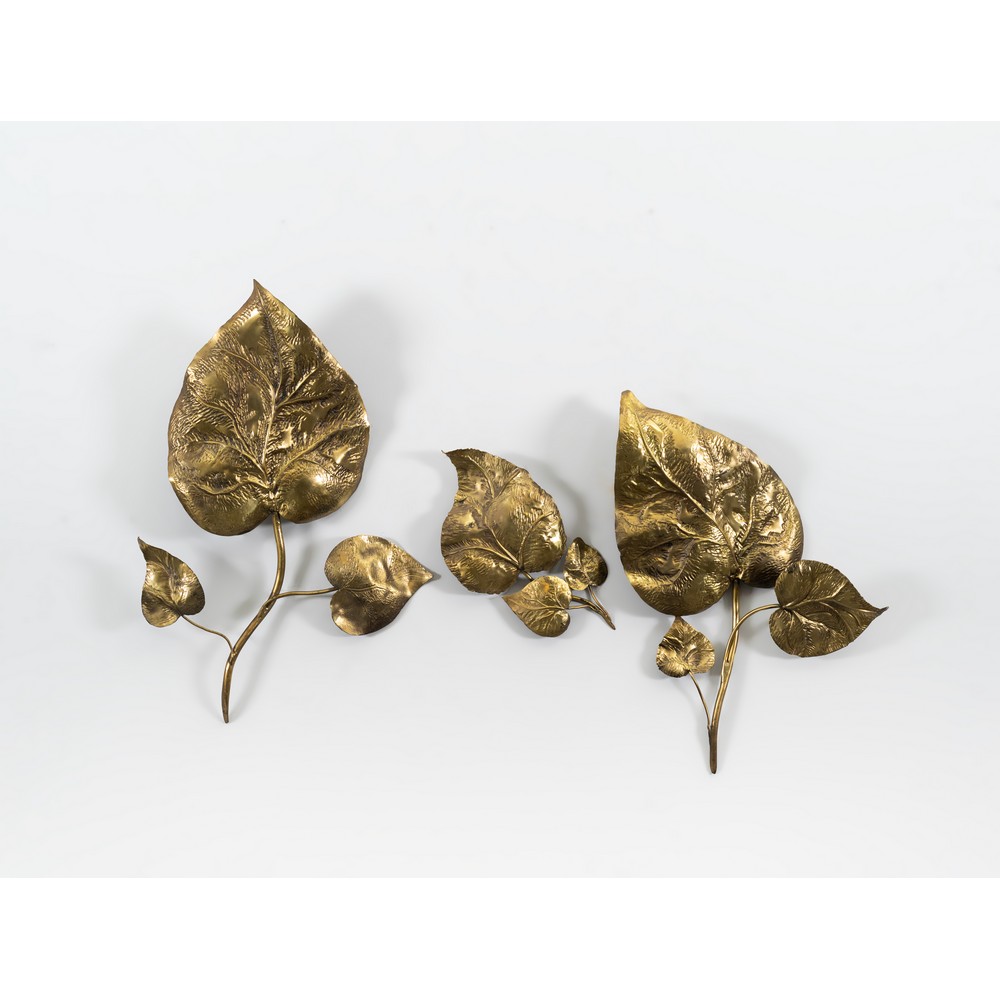 Coppia di lampade ad una luce ed una lampada più piccola da parete, struttura in ottone con diffusore composto da foglie battute a mano. Segni di uso.